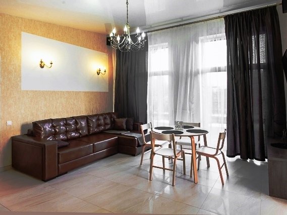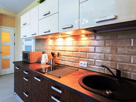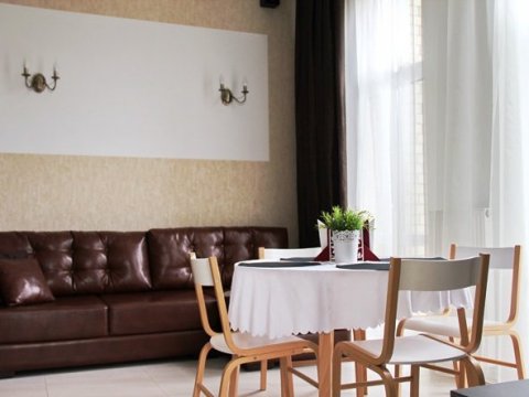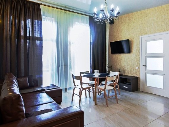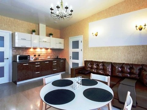 Помещения оборудованы гостиной с мягким диваном, кухней, спальней с большой кроватью, просторной душевой комнатой и туалетом. На кухне есть вся необходимая бытовая техника и посуда для приготовления любимых блюд. Общая площадь одной части дома - 55 кв. метров.