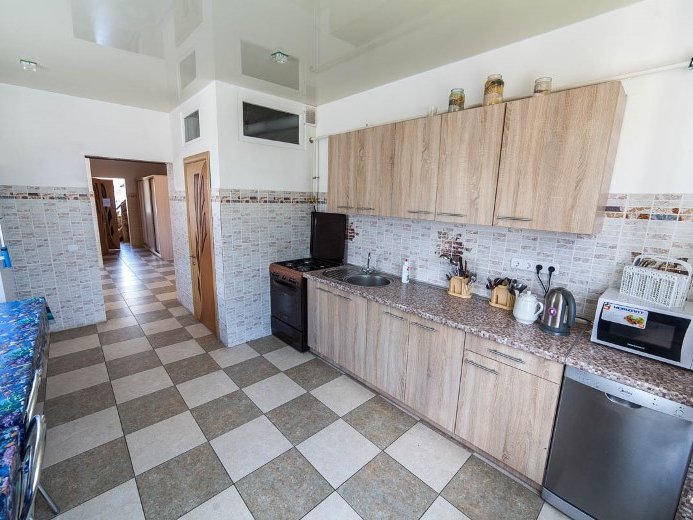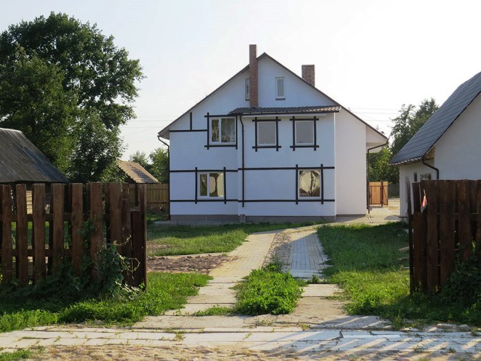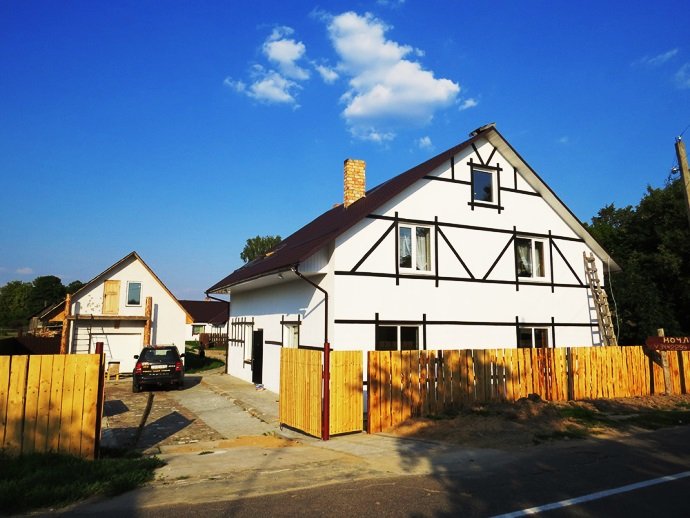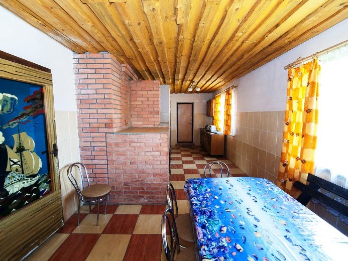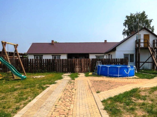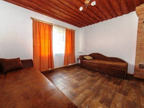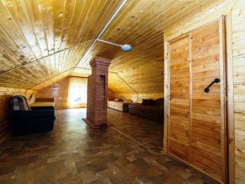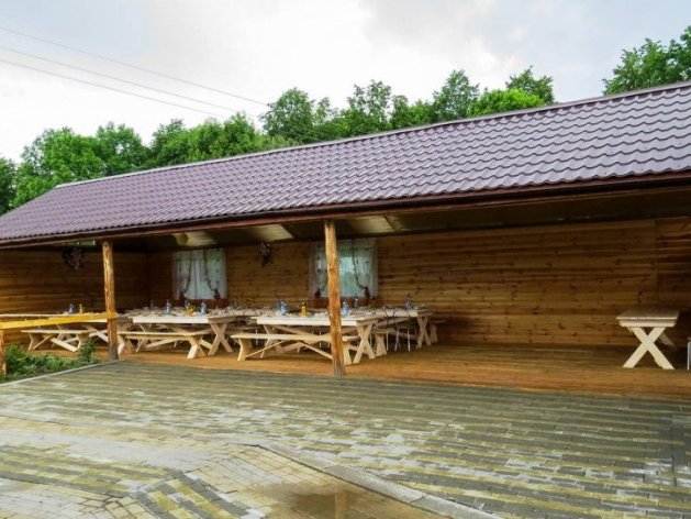 Первая зона отдыха усадьбы - большой 2-ух этажный дом с банкетным залом на 60-70 человек. Дом располагает 14-ю спальными местами (3 спальни), просторной кухней с печью, 4-мя санузлами и 2-мя душами. На территории коттеджа на сутки разбит фруктовый сад и обустроена терраса с местом для приготовления шашлыка. Все принадлежности для этого предоставляются, вам необходимо лишь позаботиться об углях.