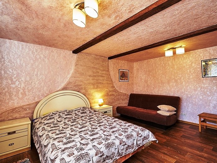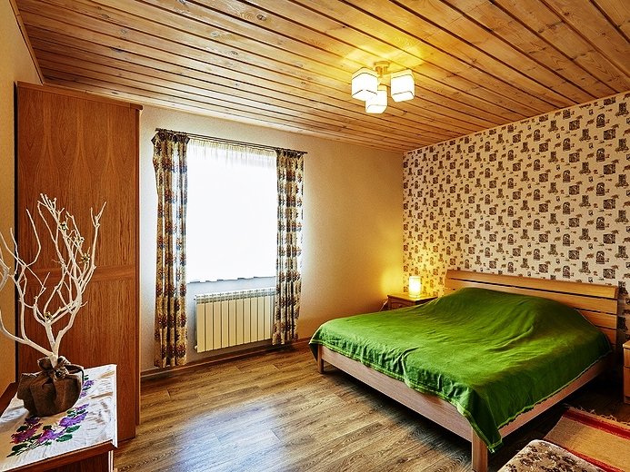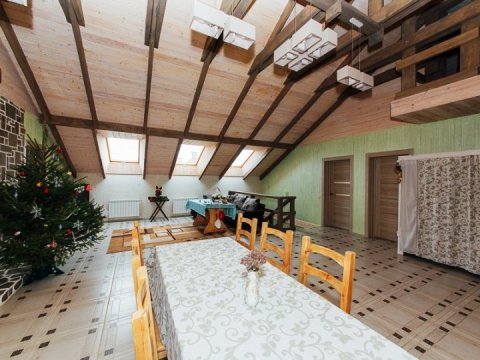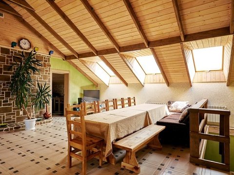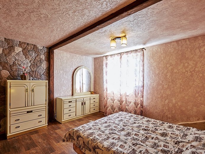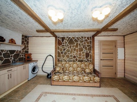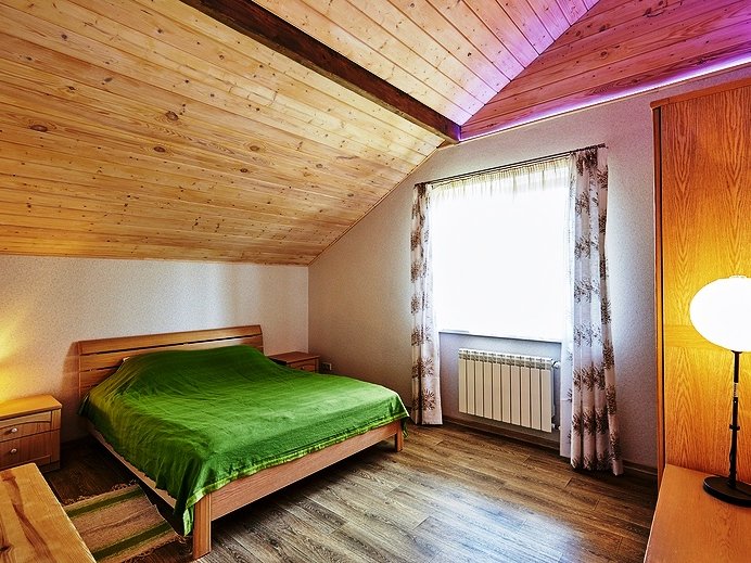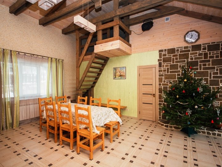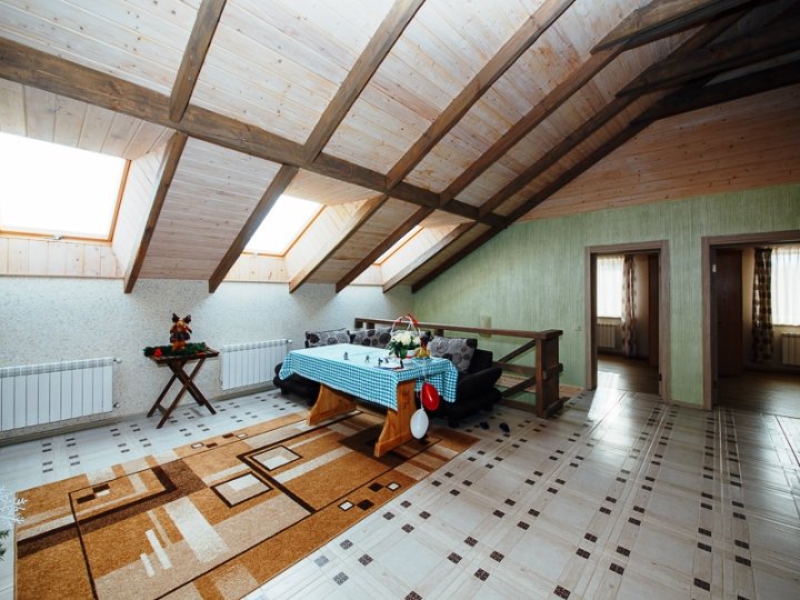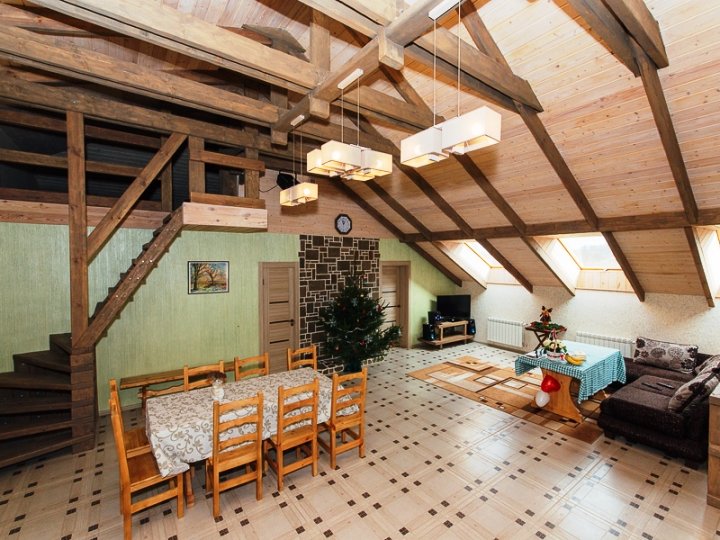 Коттедж довольно большой и поразит вас простором своих покоев, интерьер которых выполнен с использованием только натуральных материалов. В распоряжении наших гостей просторная гостиная, в которой можно провести торжество в составе до 30-ти человек. Для ночного отдыха предлагаем вам расположиться в 6-ти уютных спальных комнатах.