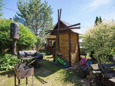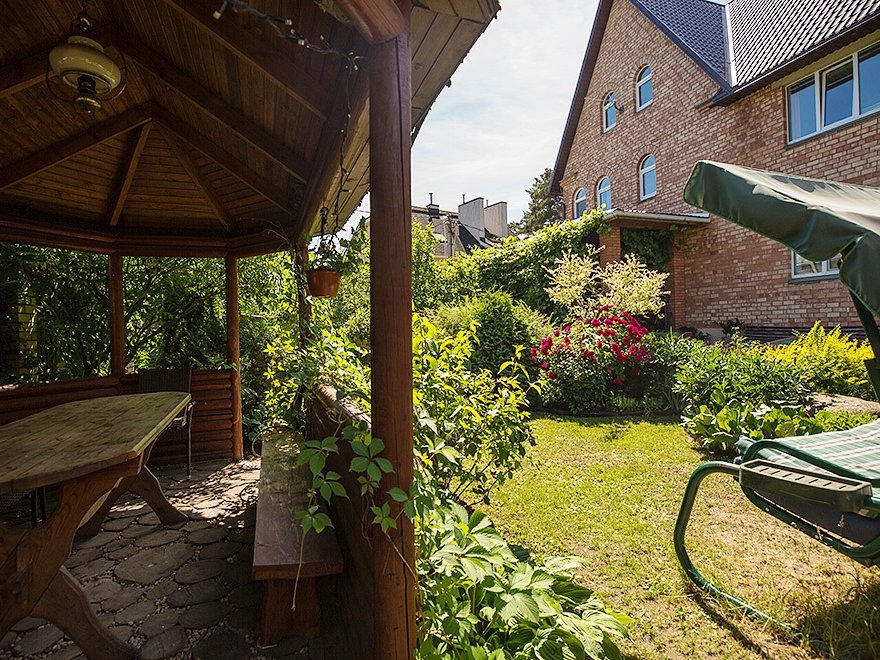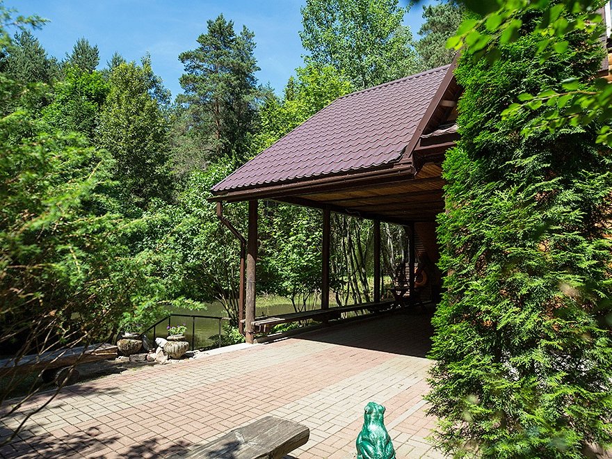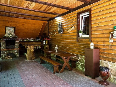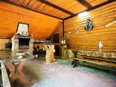 Внезапно начавшийся дождь не омрачит ваш отдых — на крытой террасе дома расположен большой деревянный стол с лавками, имеется зона для барбекю и шашлыка.
