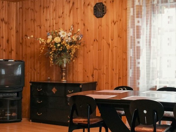 В распоряжении гостей двухэтажный дом, отделанный деревом и украшен картинами, декором и цветочными композициями. Коттедж на сутки готов принять постояльцев в любое время года.