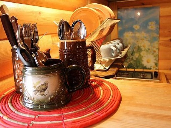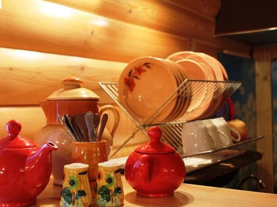 Здесь же расположена мини-кухня, в которой есть всё необходимое для приготовления еды (посуда, плита, холодильник, мойка). Так же на первом уровне оборудованы душевая и санузел.
