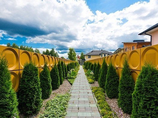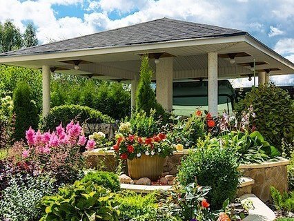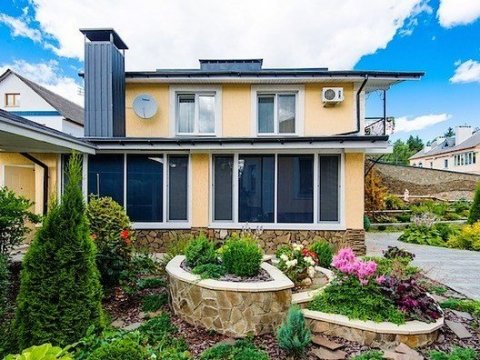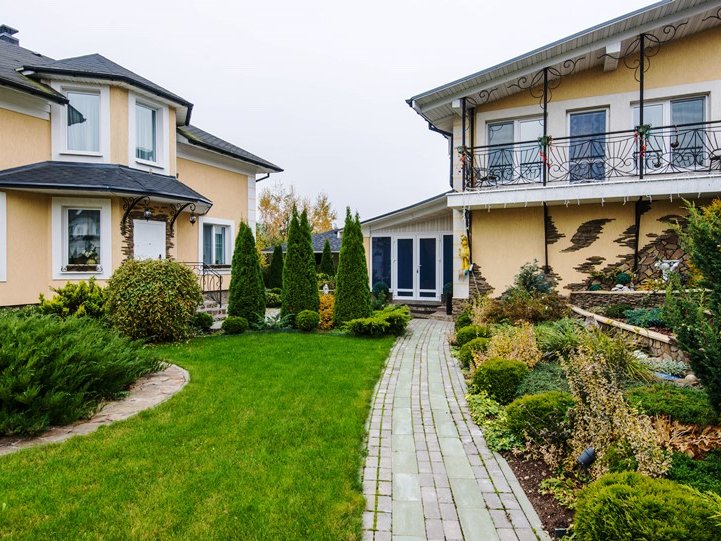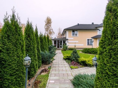 Территория усадьбы поражает красотой ландшафтного дизайна и буквально утопает в зелени. Альпийская горка, разнообразие цветов, кустарников и вечнозелёных насаждений придаёт особый колорит окружающей обстановке.