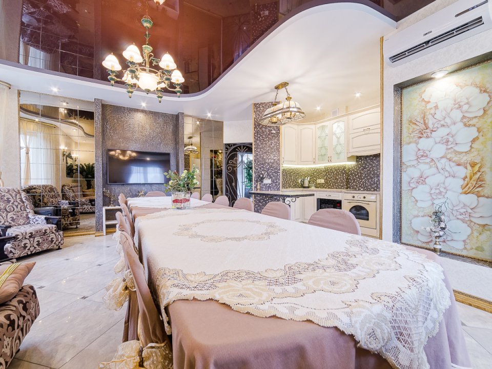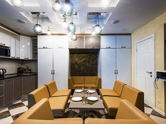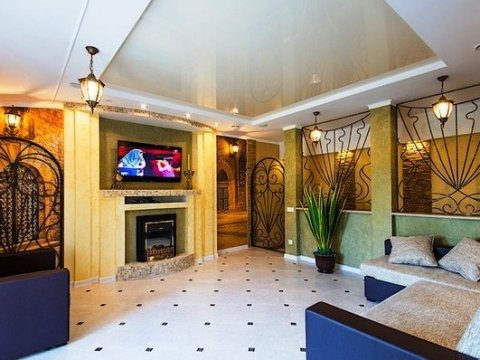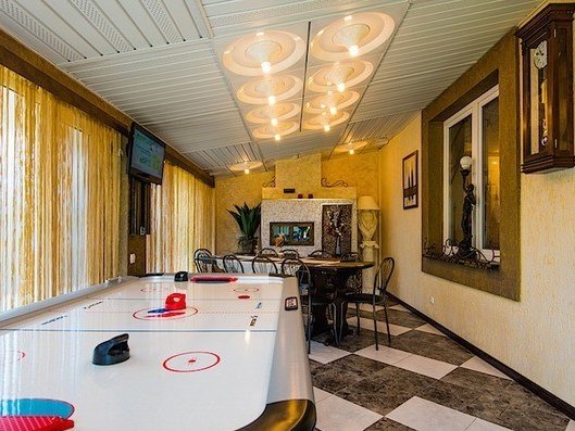 На первом этаже расположились две комнаты отдыха с аэрохоккеем, телевизором и караоке. В наличии просторная кухня со всей необходимой бытовой техникой. Имеется обеденная зона для небольшой компании. Для большего количества людей или торжественных мероприятий в распоряжении БАНКЕТНЫЙ ЗАЛ.