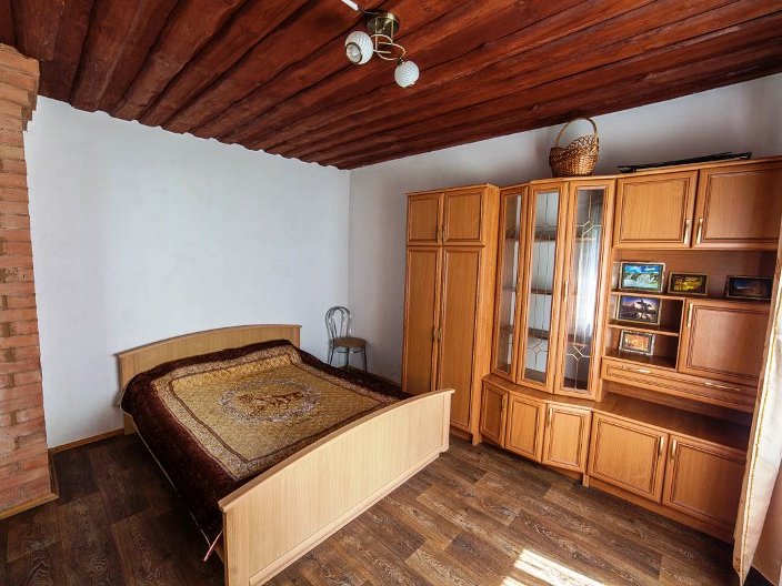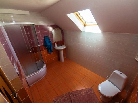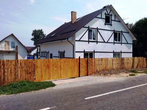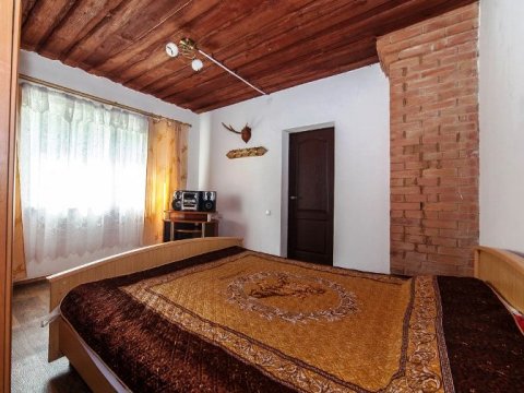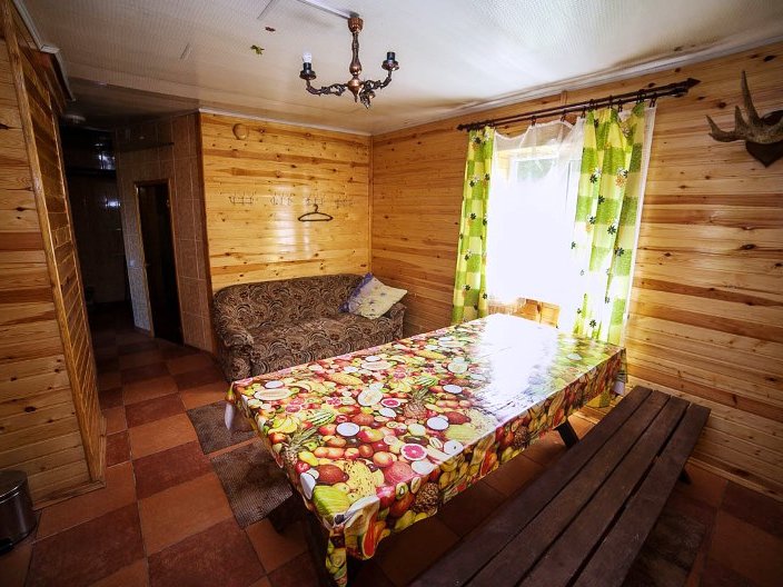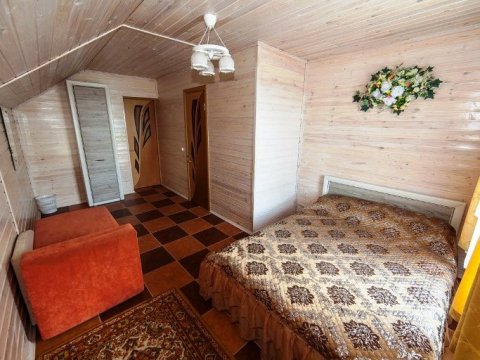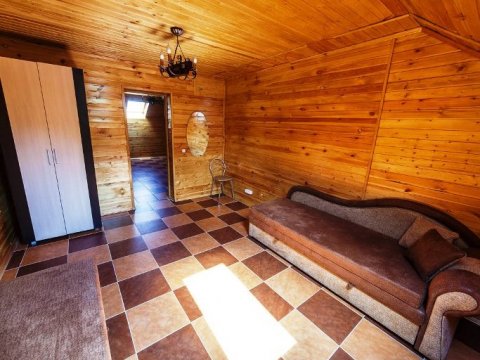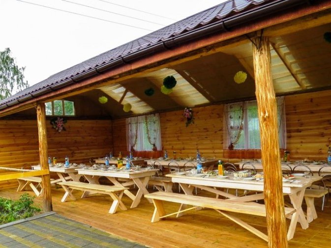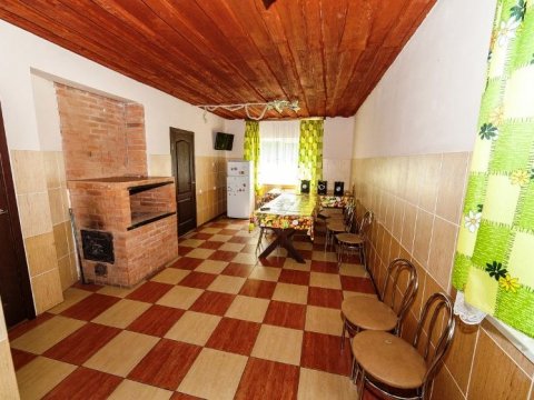 Первая зона отдыха усадьбы - большой 2-ух этажный дом с банкетным залом на 60-70 человек. Дом располагает 14-ю спальными местами (3 спальни), просторной кухней с печью, 4-мя санузлами и 2-мя душами. На территории коттеджа на сутки разбит фруктовый сад и обустроена терраса с местом для приготовления шашлыка. Все принадлежности для этого предоставляются, вам необходимо лишь позаботиться об углях.