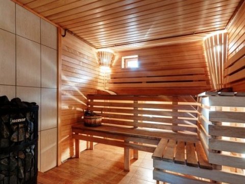 Второй дом-баня (см. коттедж № 97), который сдаётся посуточно, является целым банным комплексом, вместимостью до 10-ти человек. К вашим услугам 3 отдельные спальные комнаты. Для гостей предоставляется русская баня, после которой можно нырнуть в тёплый бассейн с внутренней подсветкой и бьющими искусственными гейзерами. В распоряжении гостей на втором этаже бильярдная комната.