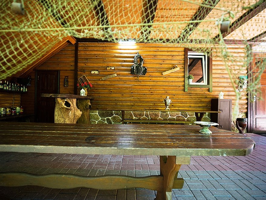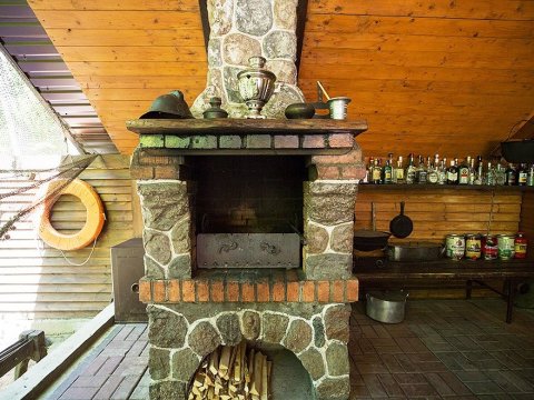 Внезапно начавшийся дождь не омрачит ваш отдых — на крытой террасе дома расположен большой деревянный стол с лавками, имеется зона для барбекю и шашлыка.