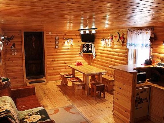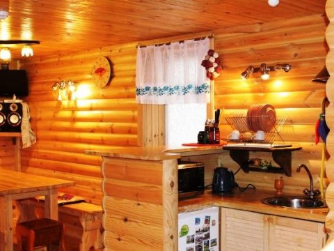 На первом этаже коттеджа на сутки находится гостиная с двуспальным диваном и телевизором, спутниковым TV, DVD и караоке. Во всем доме есть интернет Wi-Fi.