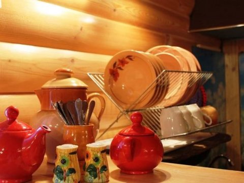 Здесь же расположена мини-кухня, в которой есть всё необходимое для приготовления еды (посуда, плита, холодильник, мойка). Так же на первом уровне оборудованы душевая и санузел.
